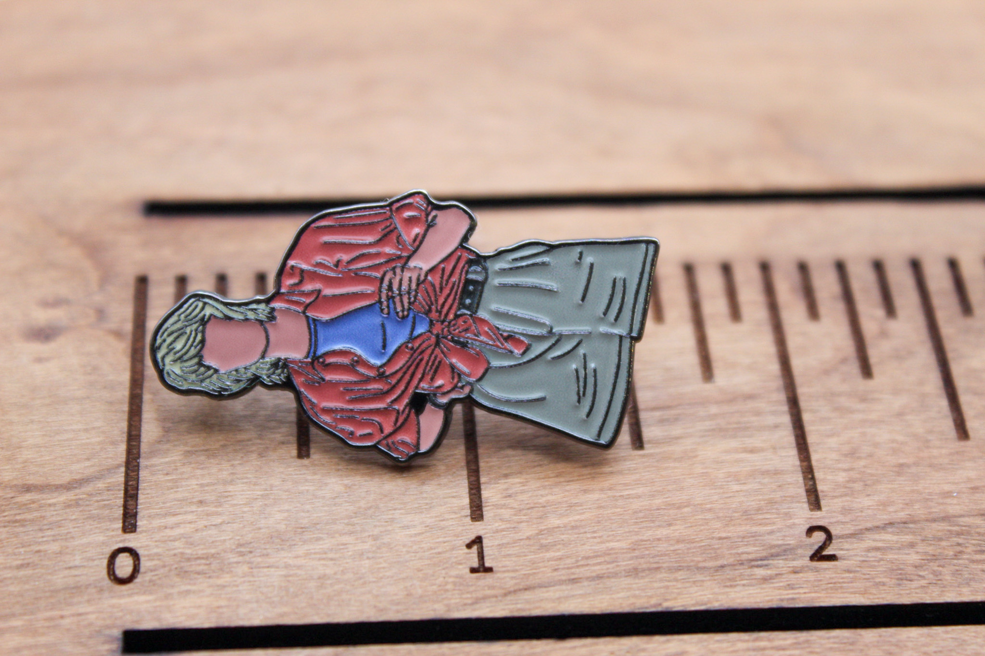 Each pin is 1.5 inches tall and about 1 inch wide. This Dr. Ellie Sattler pin has 2 posts and comes with 2 soft rubber backings.