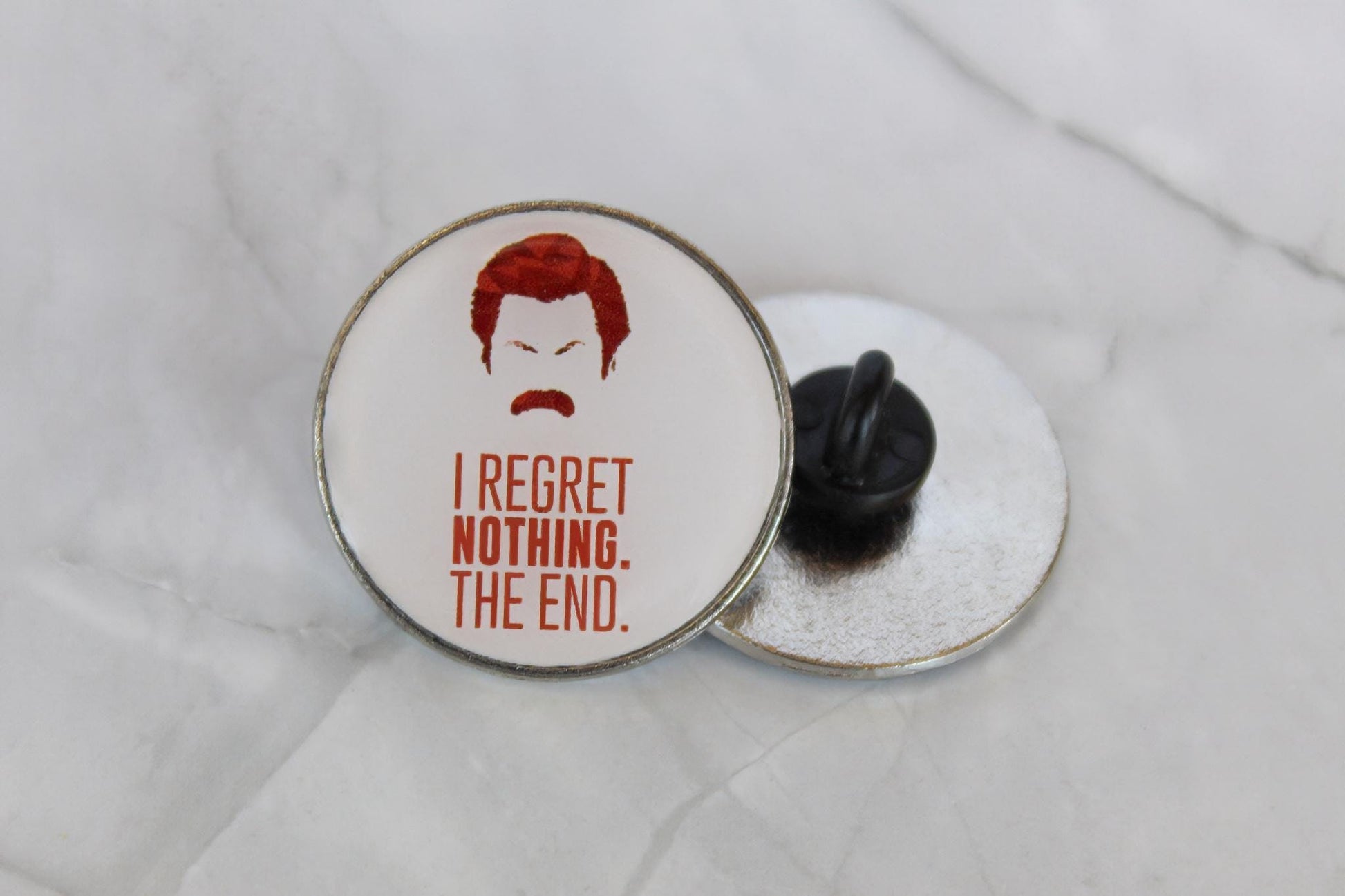 Each Ron Swanson pin is about 1 inch in diameter and comes with a soft rubber backing.